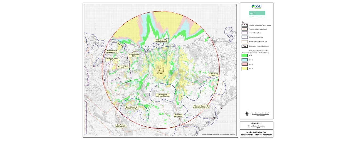 ASH continued to support SSE on Strathy South Wind Farm, with LVIA input into an Addendum in 2013 and a Further Information Report in 2014, in addition to acting as Expert Witness at the subsequent PLI in 2015. The development received consent from the Scottish Ministers in April 2018 for a 39 turbine scheme with a generating capacity of 133MW.